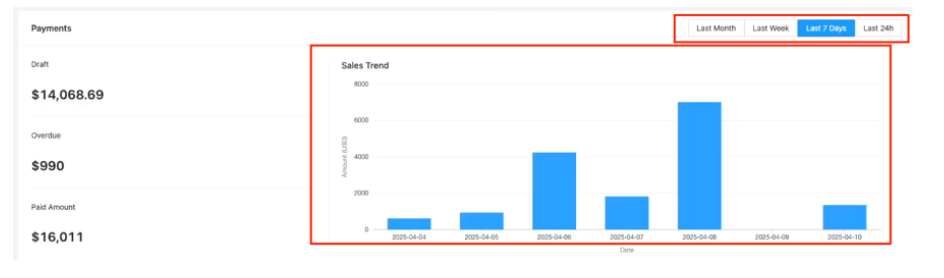 • Sales Trend: A visual graph showing sales trends over time. You can filter this view by: