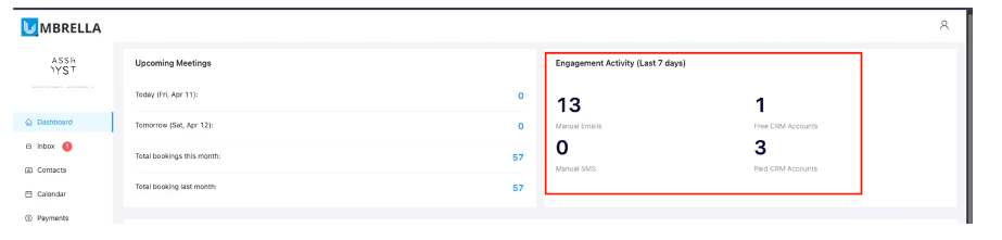 • Engagement Activity (Last 7 days): Track recent outreach, currently showing Manual Emails and Manual SMS sent. This section also displays the number of Free and Paid CRM Accounts ("Boss accounts") you have activated/sold recently. More engagement metrics will be added in the future.
