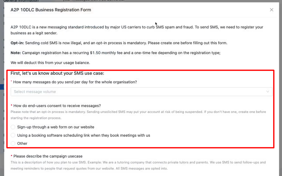 Pay close attention to all required fields (marked with an asterisk *) and provide detailed information, especially for the campaign use case and sample messages.