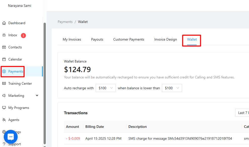 Think of the Wallet as a pre-paid balance within your account. Funds in your Wallet are used automatically to cover charges for certain services, ensuring seamless operation without needing individual transactions for every small charge (e.g. paying for an SMS message sent).