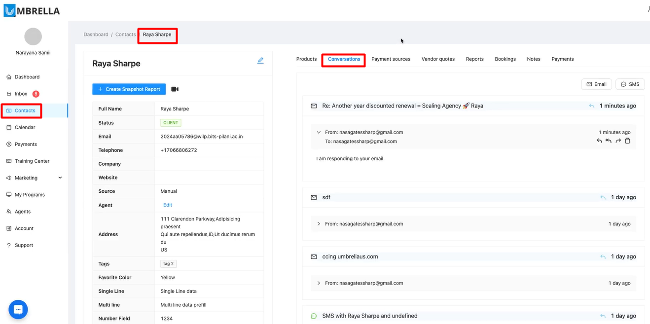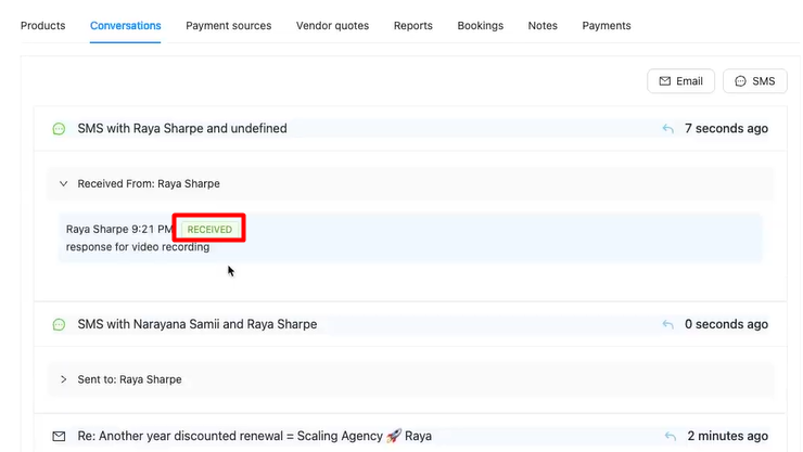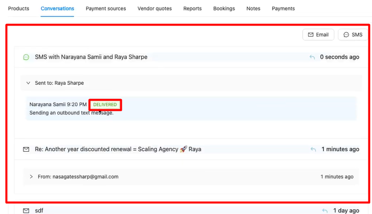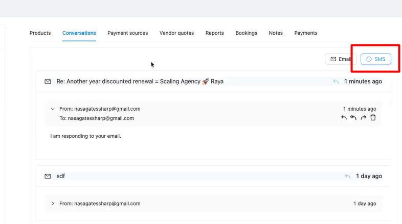All SMS messages (sent and received) and emails exchanged with this contact are displayed in the Conversations tab.