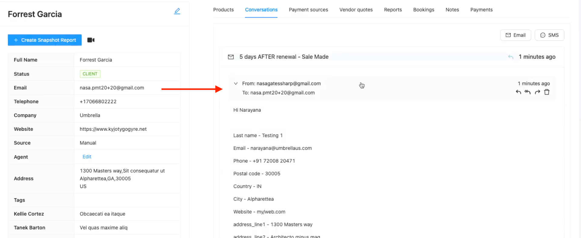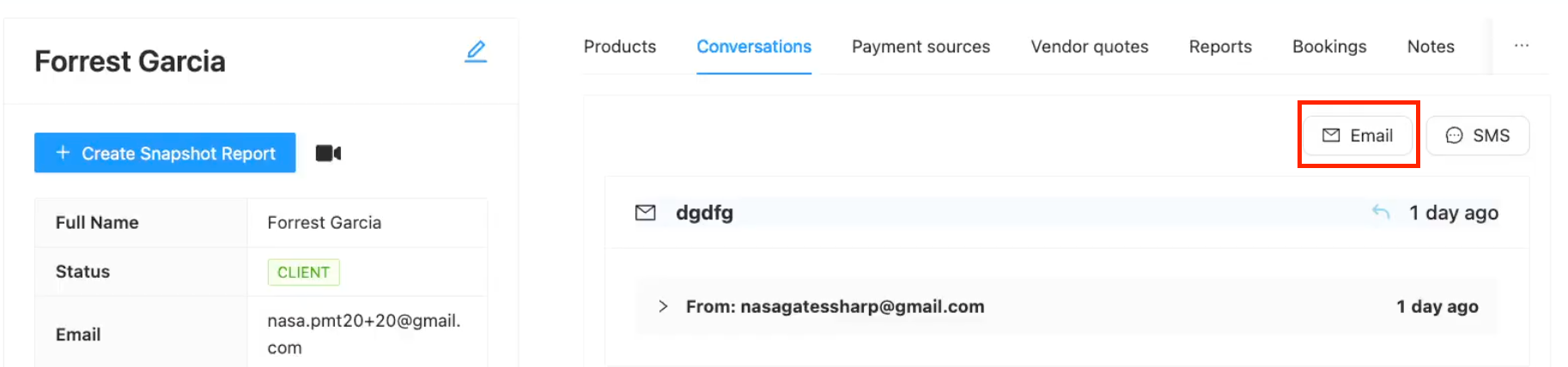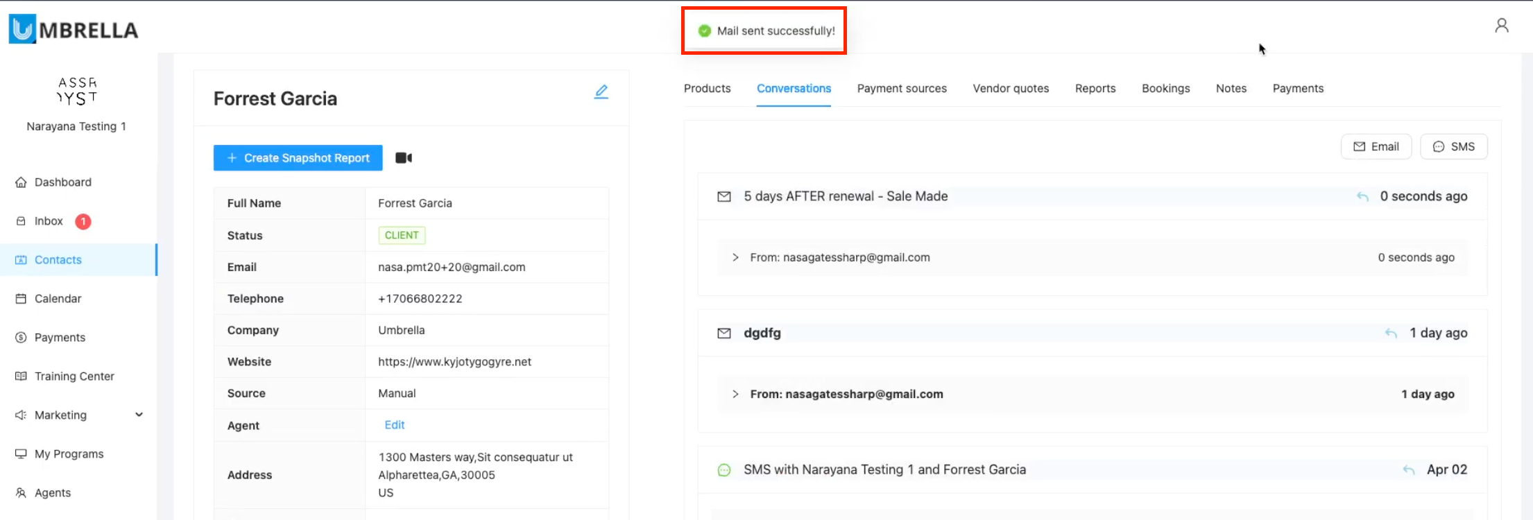 The email you just sent will now appear in the contact's Conversations history, showing the subject, timestamp, and content.