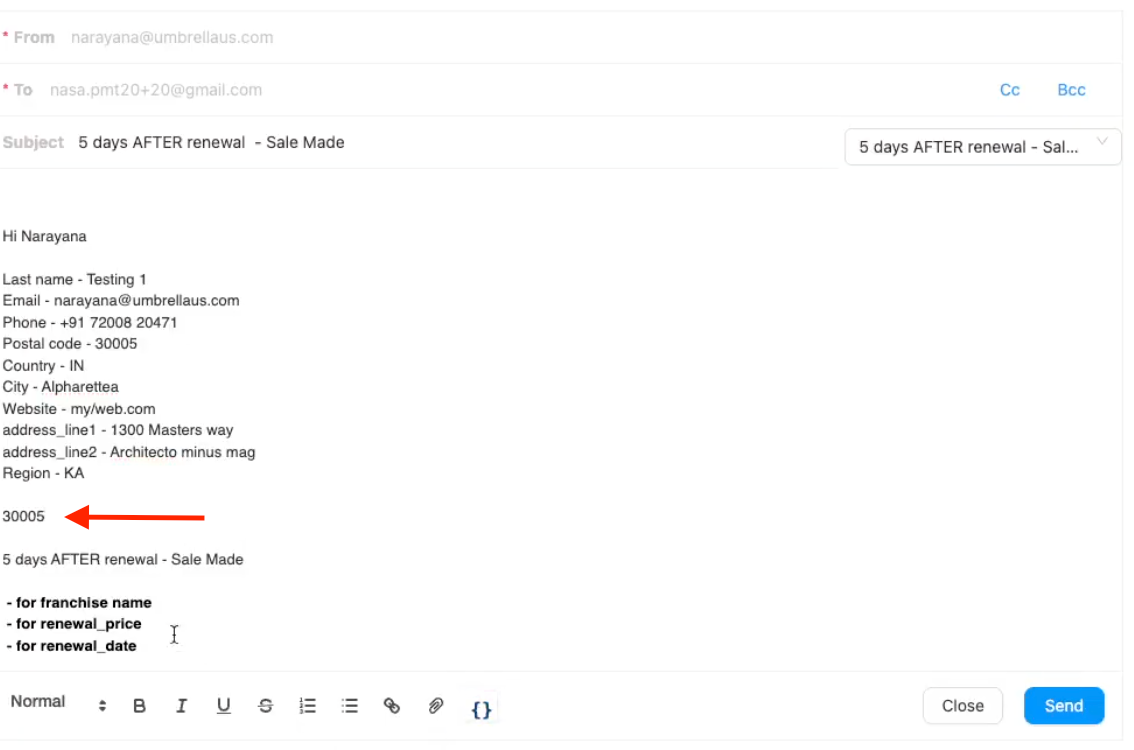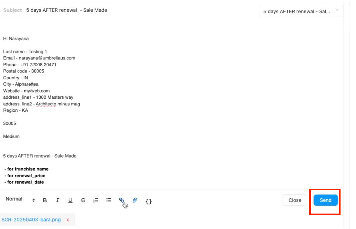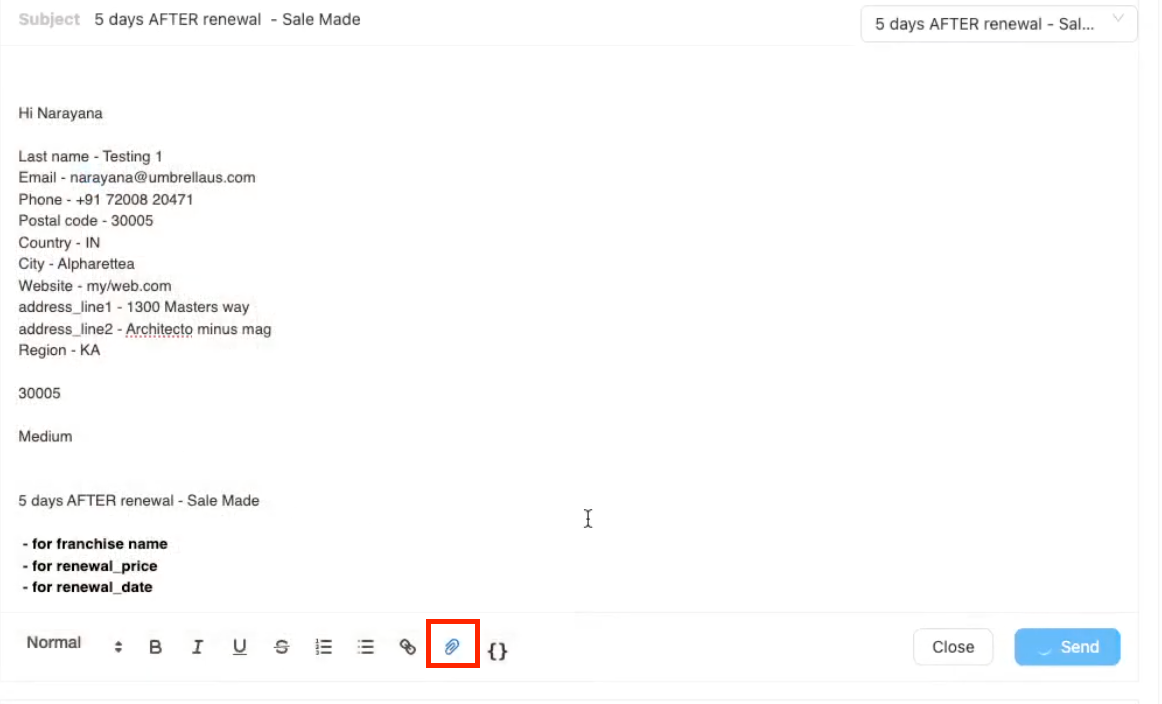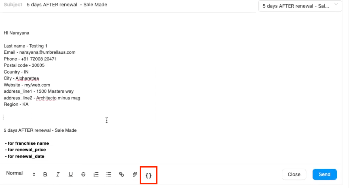 Templates often include placeholders like {{ Last name }}. To add more personalization or insert specific contact details: