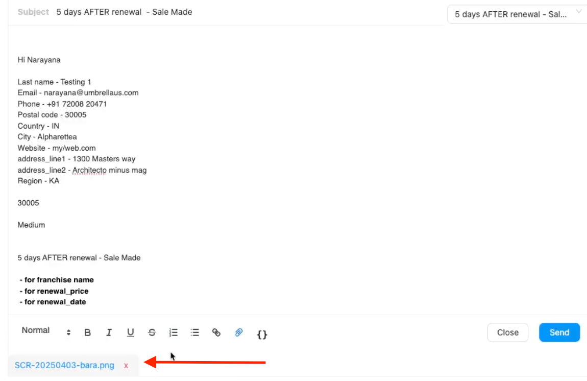 The attached file name(s) will appear below the body content area.