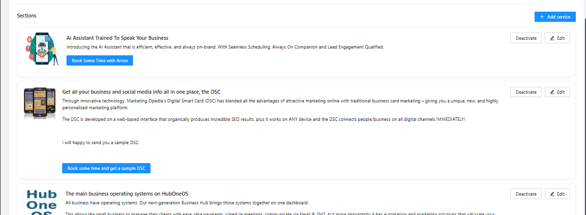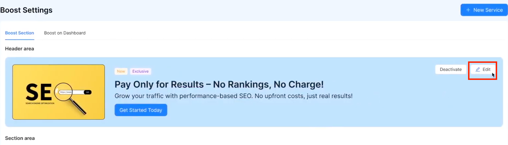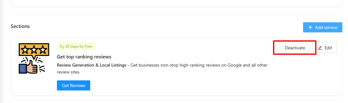 On the Boost Sections tab, both the Header area and each individual Service Section have a Deactivate button. Clicking this will hide that specific item from the client-facing Boost page and from appearing as a link on the dashboard widget.