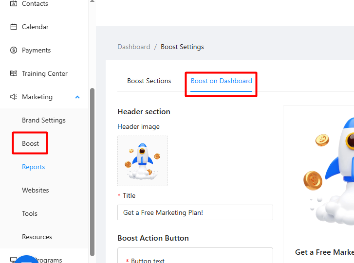 Boost on Dashboard (Right Panel): This controls the separate, smaller panel that appears on the right side of the client's main HubOne dashboard view, providing quick links and a primary call-to-action.