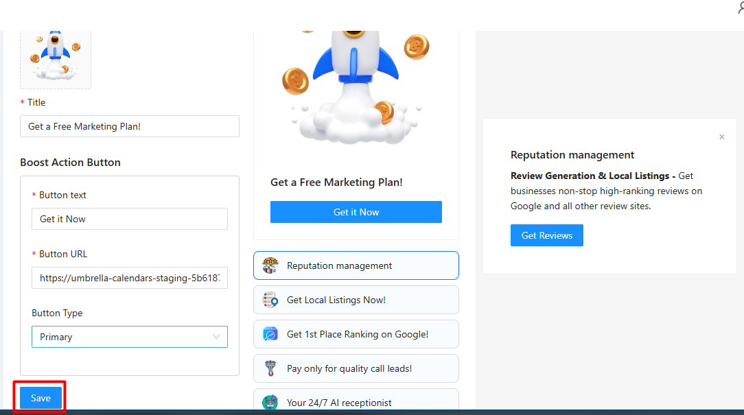 Service name: Crucial field. This is used both internally AND as the text for the link that appears on the "Boost on Dashboard" right panel. Examples: "Amazing Websites", "Pay Per Result SEO," "Local Service Ads."
