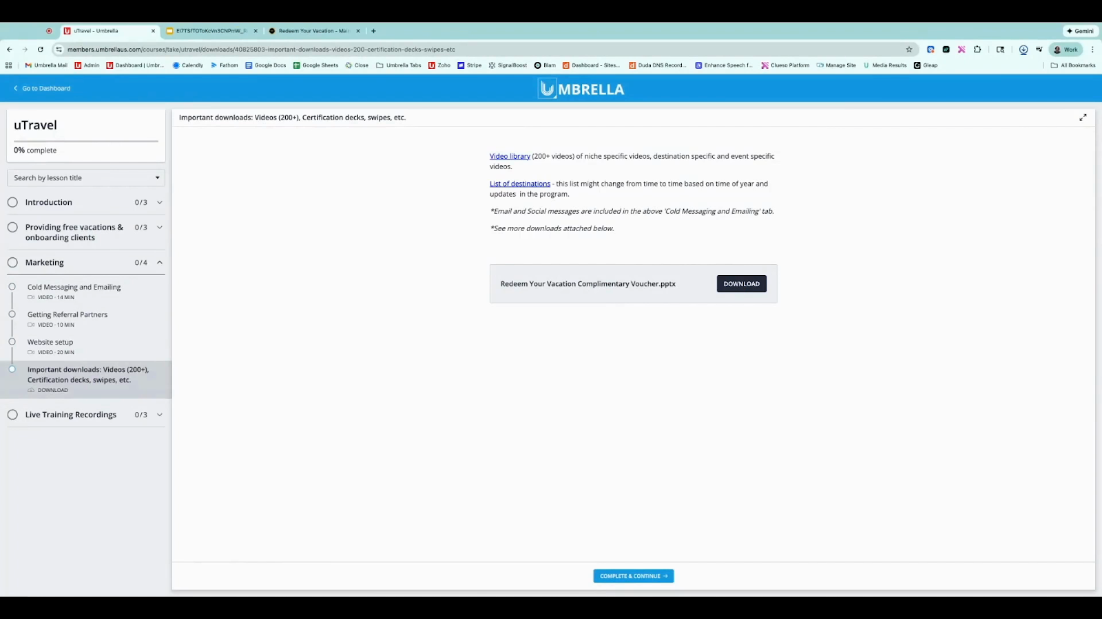 Open U Travel Training. In the Marketing dropdown, select Important Downloads and download the Redeem your vacation complimentary voucher.