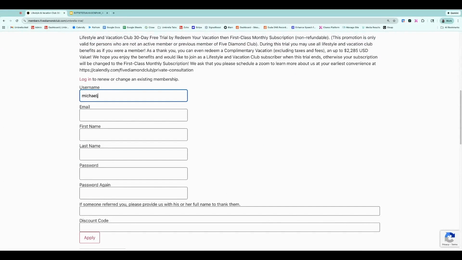 They select Continue and fill out the registration form—username, email, name, password, and your name as referrer. Enter the discount code from the certificate.