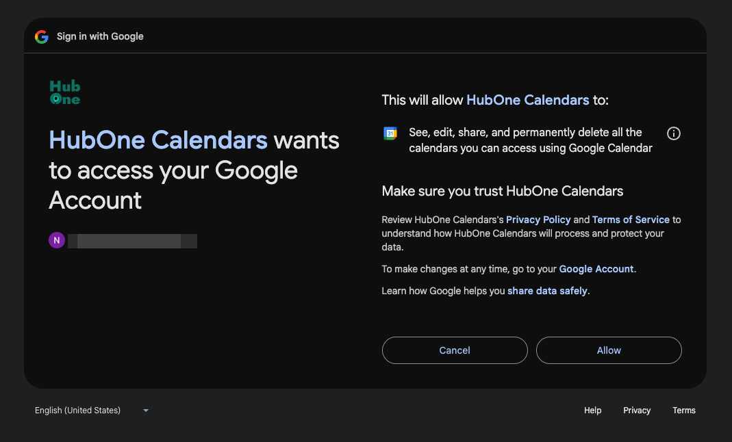 Click on “Connect Google Calendar” which will take the next page on Google.