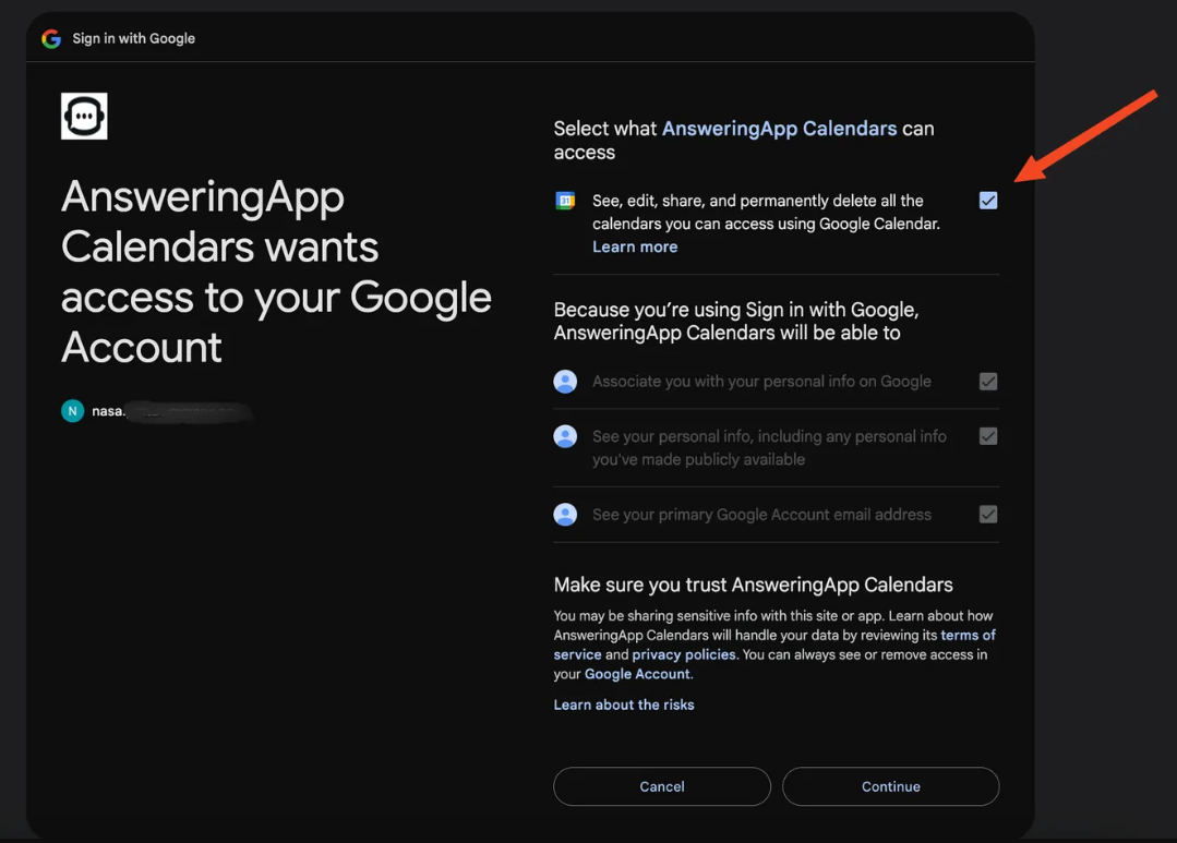 Click “Continue” after selecting the checkbox that Google shows