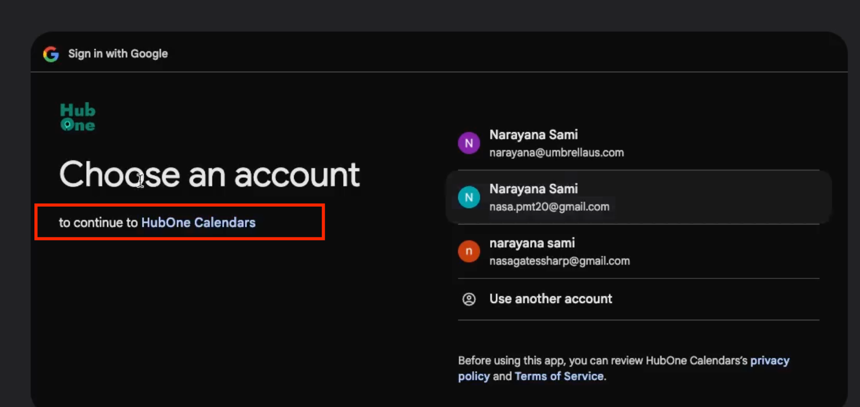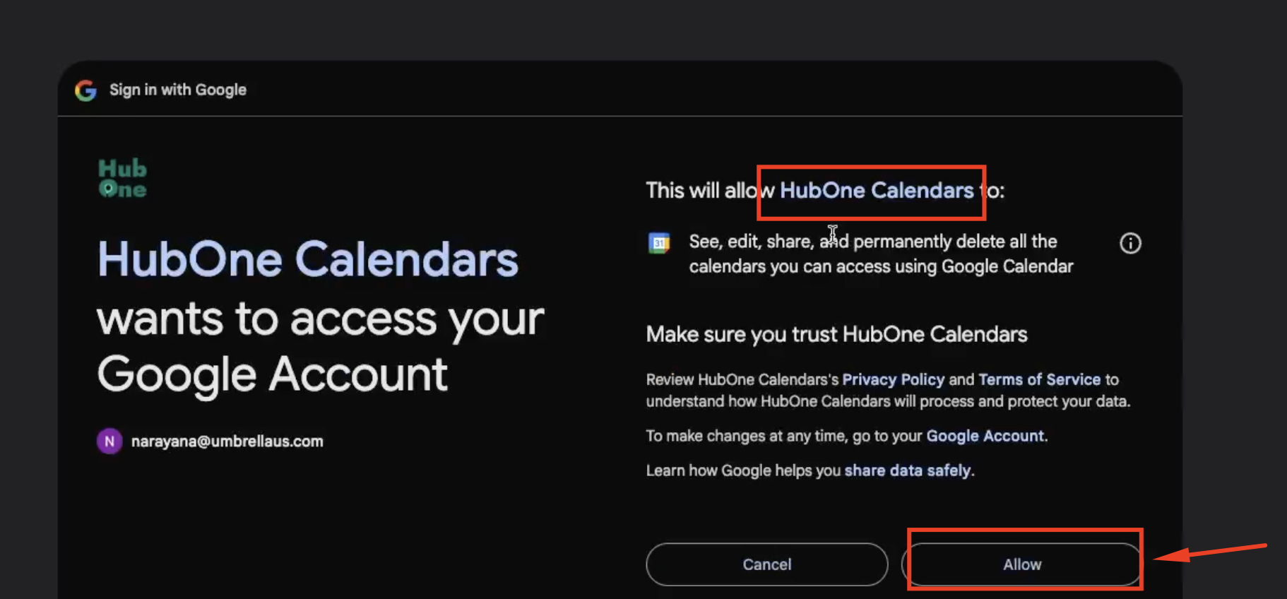 Follow the Google sign-in and permission prompts (you'll see the HubOne branding).