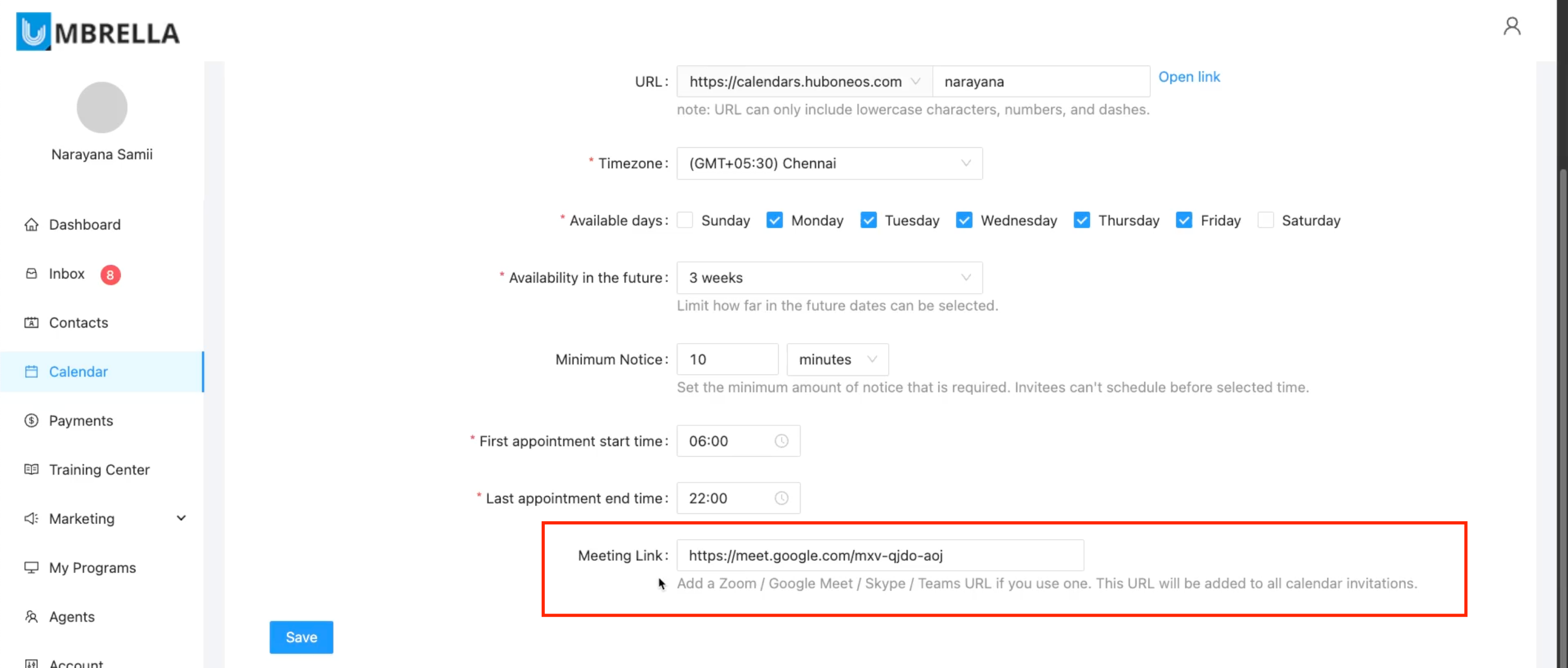 You can automatically include your preferred video conferencing link (like Google Meet, Zoom, Teams, etc.) in the calendar invitations sent out when someone books an appointment.