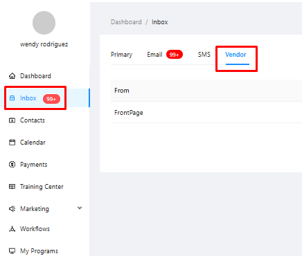 To find this message, navigate to the main Inbox from the left-hand menu and click on the Vendor tab.