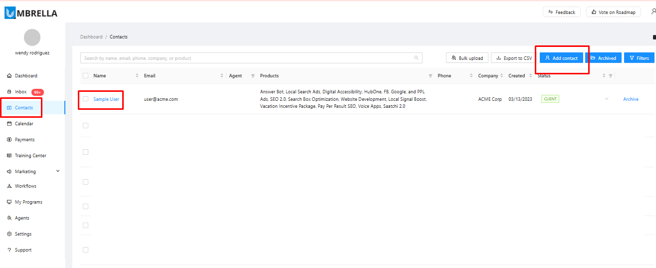 First, navigate to the Contacts section from the main left-hand menu. You must have a contact record for the person or company you are purchasing the setup for.