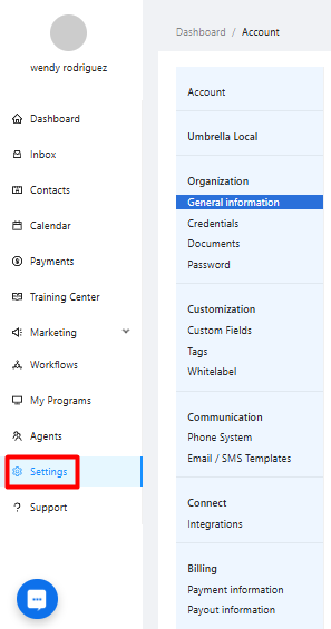 Use the secondary left-hand menu within the Account section to navigate between: General Information, Credentials, Documents, Password, Custom Fields, Tags, Whitelabel, Phone System, Email/SMS Templates, Integrations, Payment Information, Payout Information.