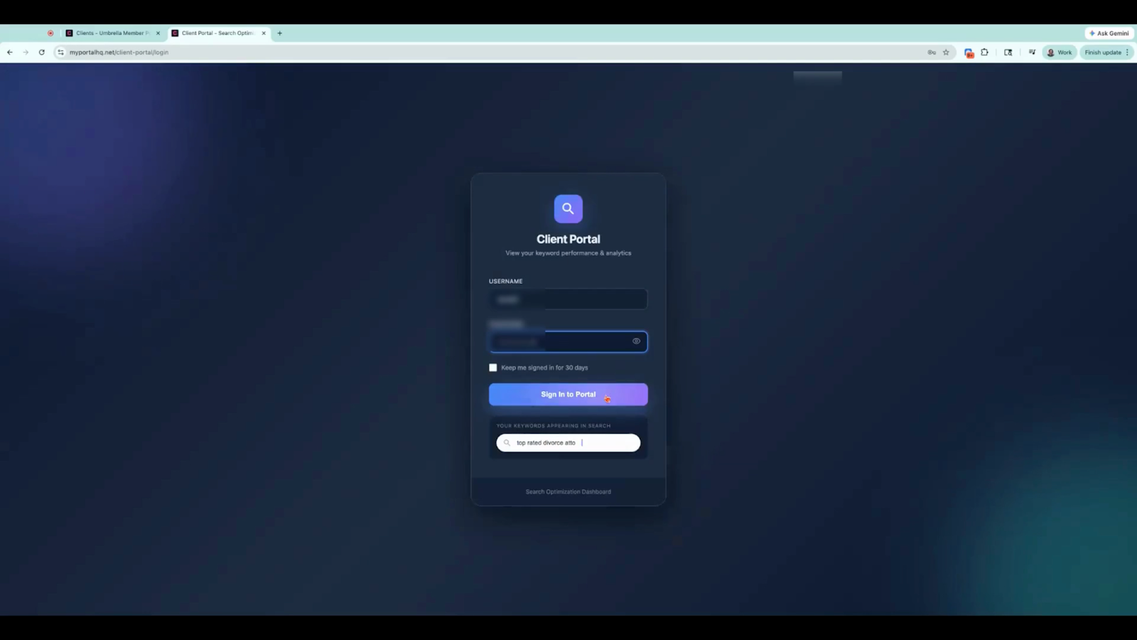 After logging in, clients will see their reporting dashboard displaying their business name, campaign data, and keyword performance. The portal interface typically displays a gray-labeled reporting dashboard where clients can view campaign progress and rankings.