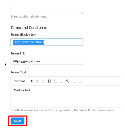 Terms and Conditions: Define the display text (e.g., "Terms and Conditions"), provide a link to your full terms (optional), and/or write out specific terms directly in the text box. Customers may need to agree to these when paying.
