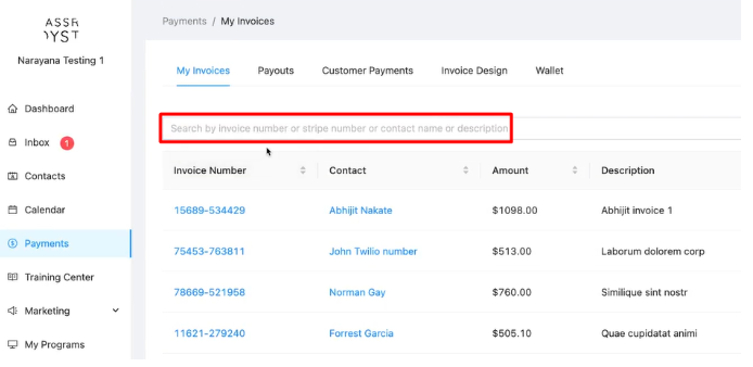 Use the search bar above the list to find invoices by: