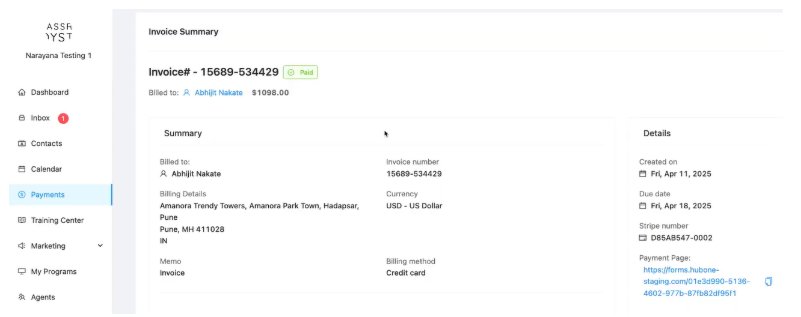 Details Section: Shows Creation Date, Due Date, Stripe Number (if applicable), and the unique Payment Page link that customers use to pay. You can copy this link.