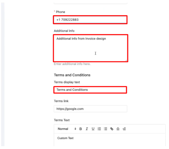 Additional Info: Add any standard text you want included on every invoice (e.g., payment instructions, company registration number).