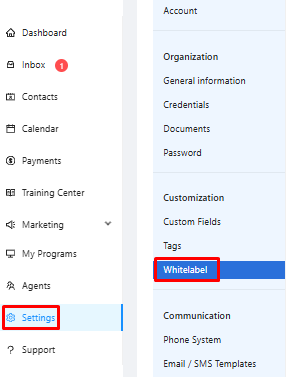 Navigate to White-Label Settings: Log in to your account, go to Setting sand select White-label: