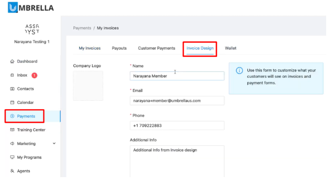 Sender Information: Set the default Name, Email, and Phone number that will appear as the sender on the invoice.