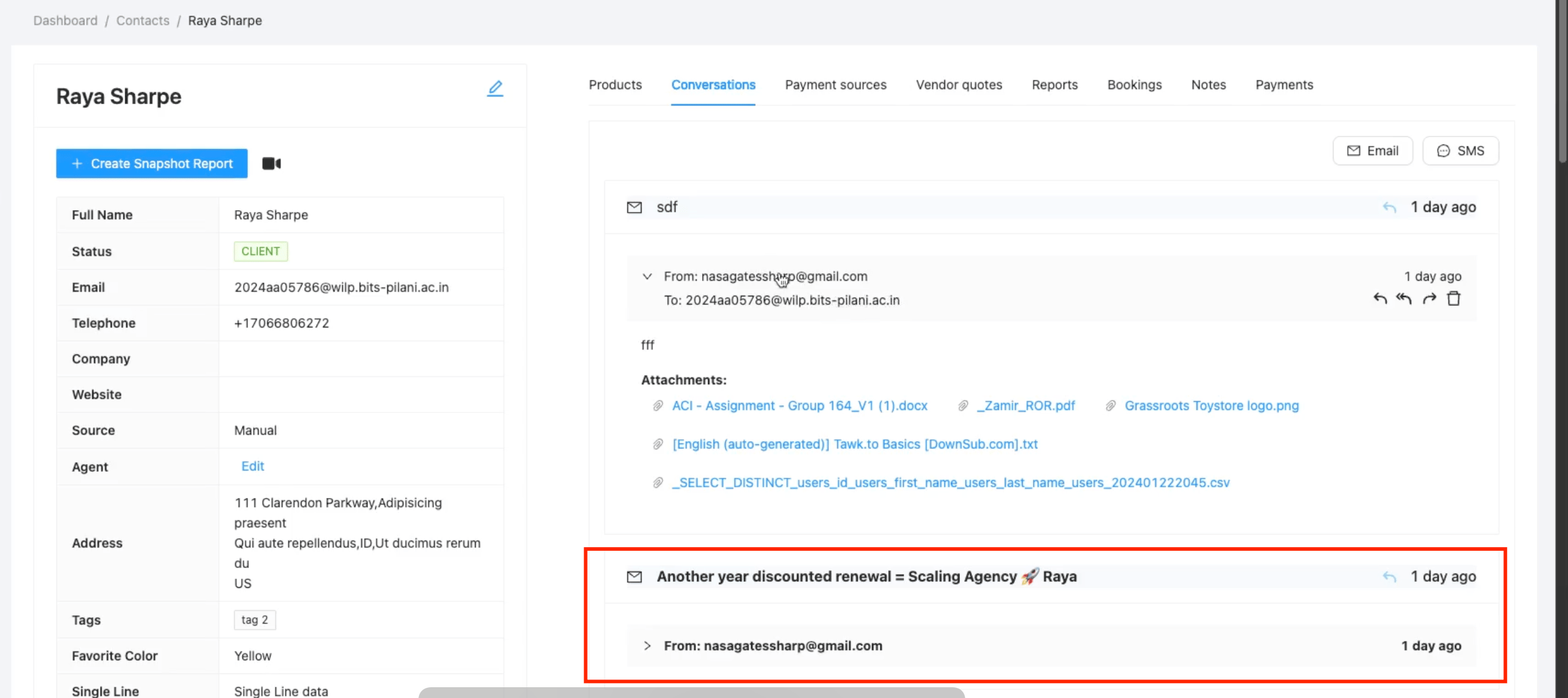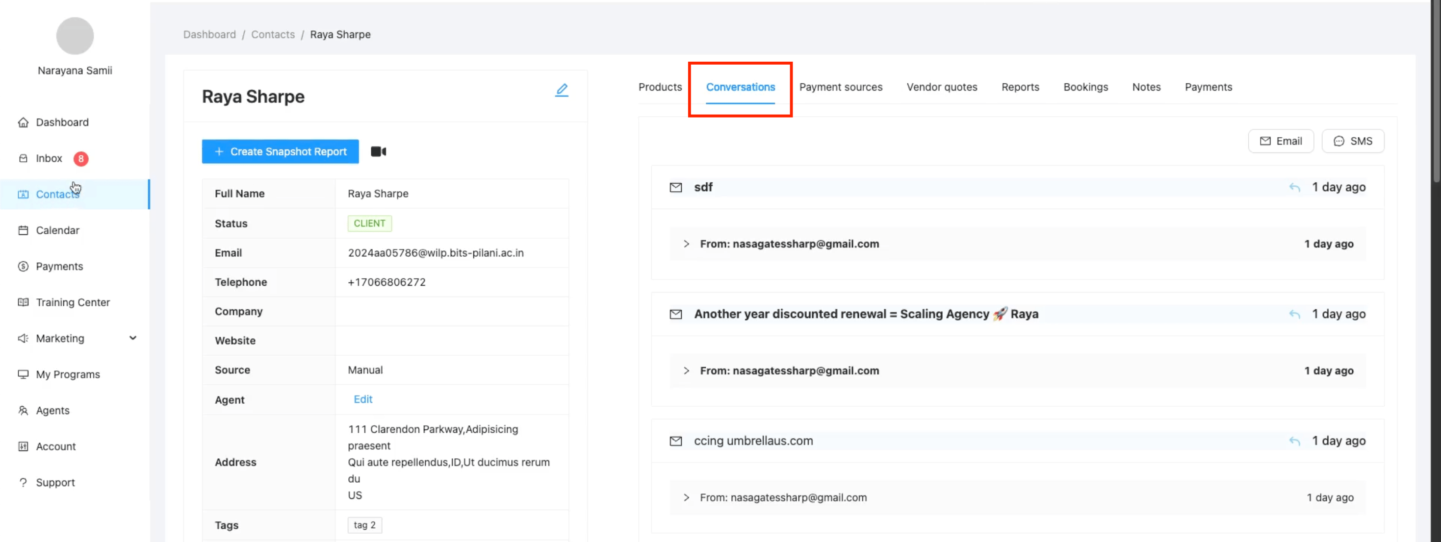 The Conversations tab displays both Email and SMS messages sent to and received from this specific contact.