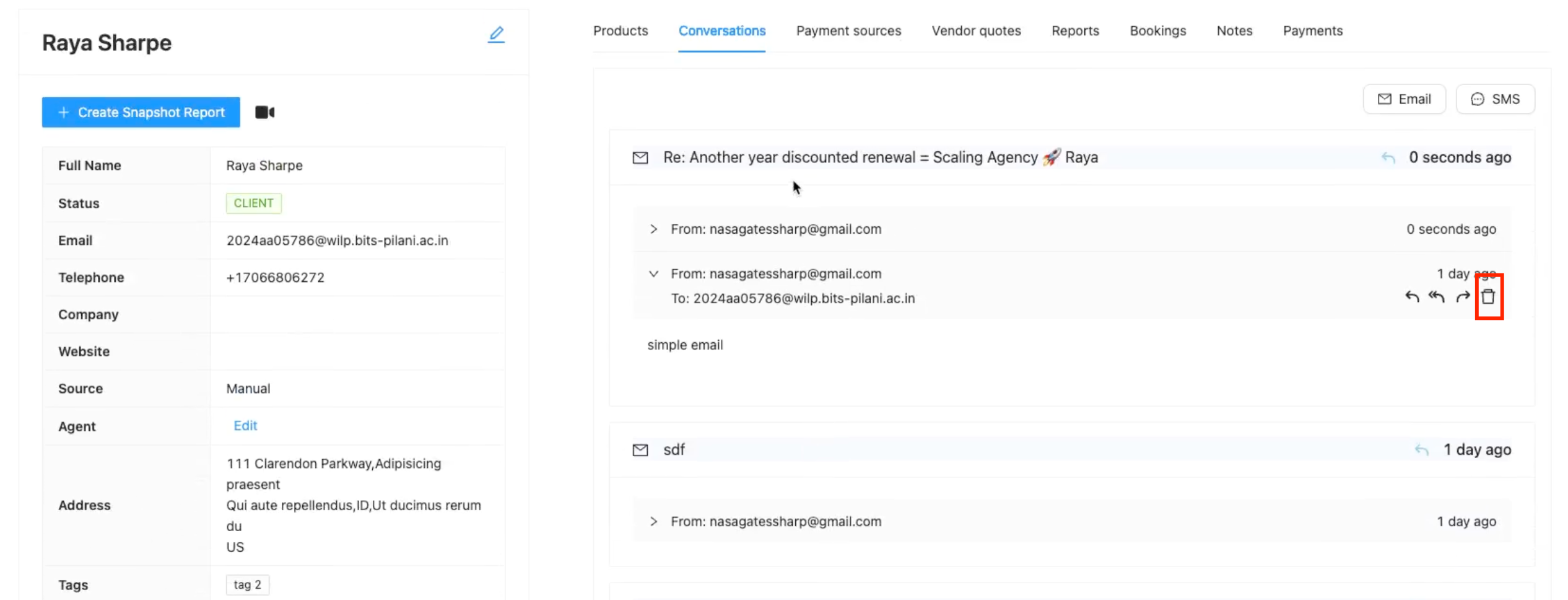 The Conversations tab acts as a dedicated inbox for each contact, keeping all direct communication history organized and easily accessible in one place.