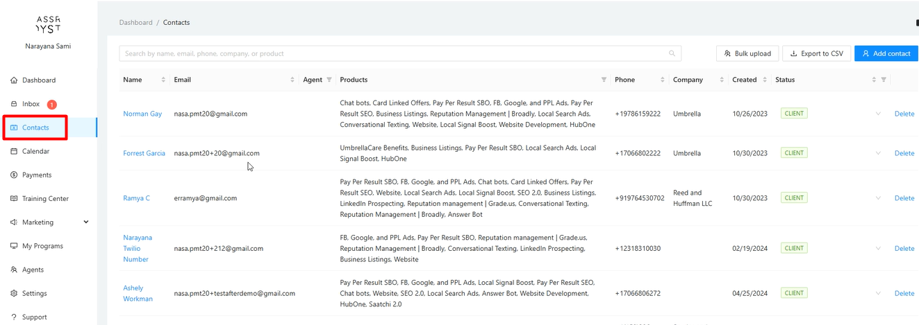 Status: The current stage of the contact (e.g., Client, Lead, Opportunity, New). You can filter by status.