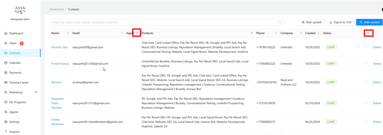 Agent: The assigned internal team member (if applicable). You can filter the list by agent.