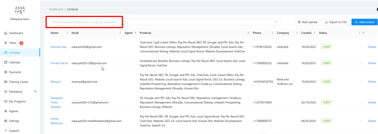 You can enter keywords related to any of the displayed fields (Name, Email, Phone, Company, Product, etc.). The list will dynamically update to show matching contacts.