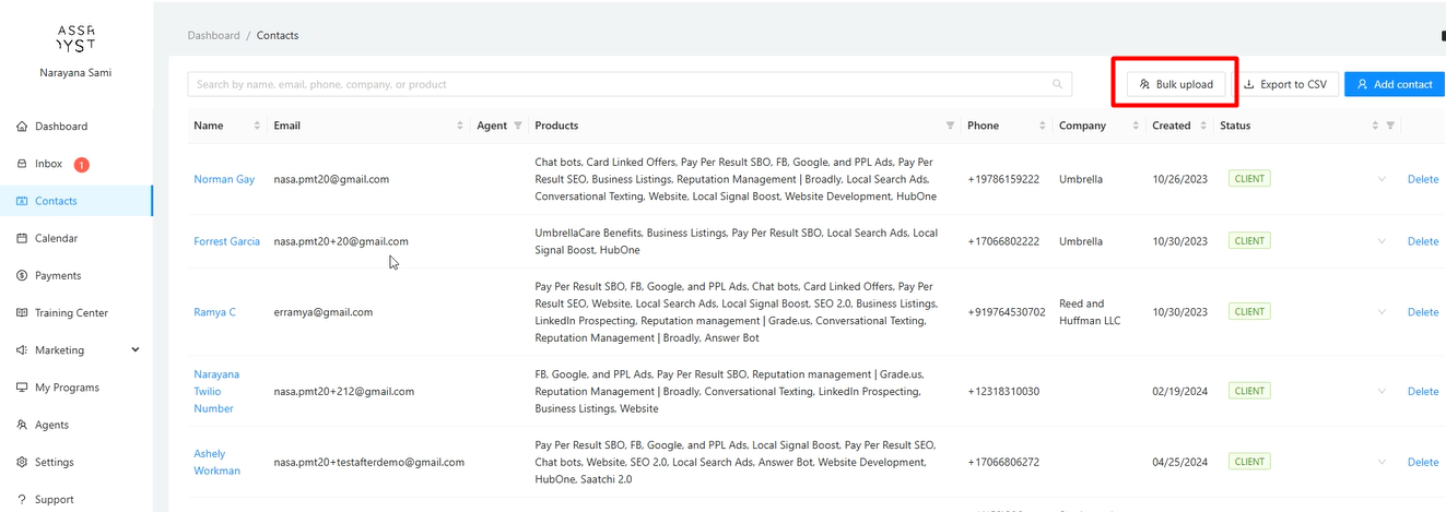 Click the Bulk upload button near the top right to import contacts from a CSV file. The process involves three steps: